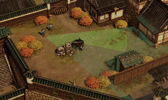 In Shadow Tactics players control a squad of up to five different specialist characters to sneak and stealth-kill their way through large maps filled with enemy setups. These function as puzzles with multiple solutions.One of the most important tools the player has is the ability to display enemy vision in the form of a cone that we call Viewcones. The Viewcone has different colored areas that determine its behavior (more on that later).