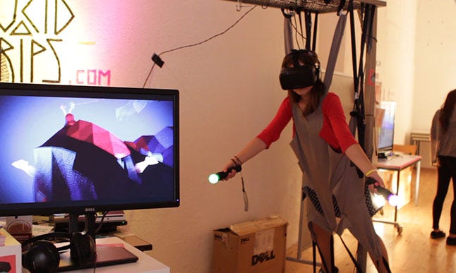 In early development we used the Oculus Rift DK1 and Razer Hydra, which at the time delivered precise data. At that time there was no expectation at all that something like the setup we used would be anywhere near to release for consumers. So we focused on pushing immersion as far as possible and worked on a full body installation with a kind of hammock that keeps you standing or kneeling in a 30 degree forward angle.
