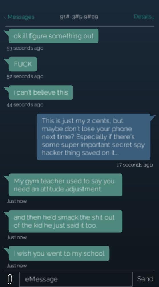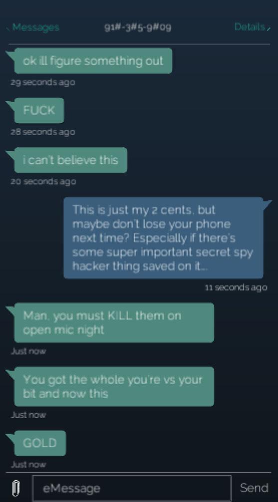 After all, it was the game’s core design objective and we worked tirelessly to get it to accurately simulate the speech patterns of real world conversations. So when making Exfiltrati0n, we knew it would be crucial to nail the very specific rhythm and cadences of real life texting in order for players to fully invest in the story.