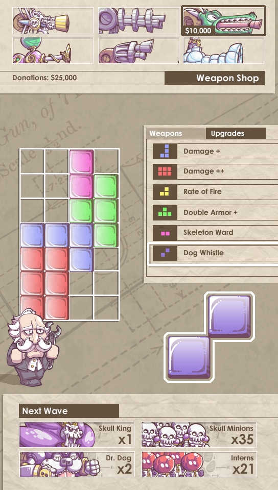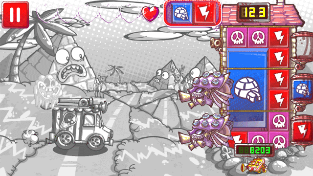 Back then, the game really demanded a lot of player attention. You loaded guns from the puzzle grid in real time, and aimed those guns manually by dragging their line of sight toward enemies. Enemies followed a pre-determined wave, culminating in a boss.