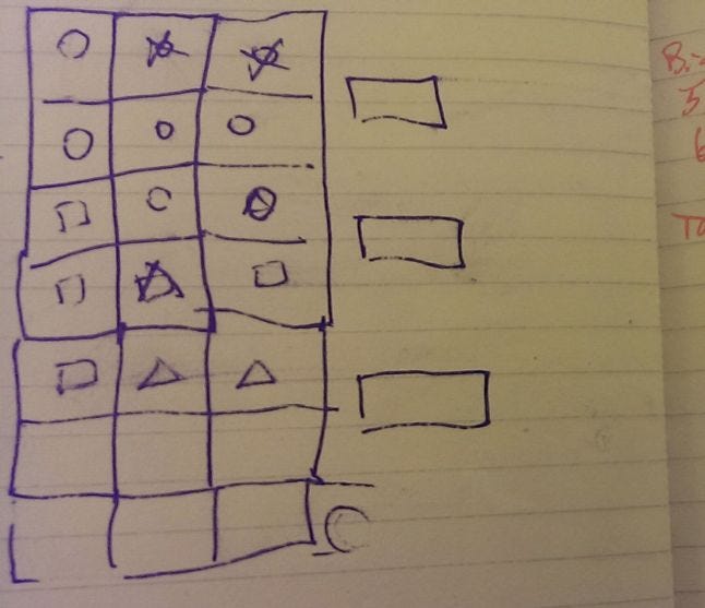 I liked the idea of a puzzle and tower defense hybrid, so I went back to pen and paper. I drew a box the size of a PlayStation Vita screen, since that was our main target platform at the time. Then I marked off how much of it I thought I could reasonably use for puzzles, while still leaving room to show our big and colorful enemies. I divided that puzzle space into a grid of squares that I could definitely touch with my whole fingertip. Now I had a 3x6 grid to work with. But I had no idea what to do with grid that small! I needed a house, guns, enemies, and a puzzle grid to all fit on a 966x544 screen or smaller.