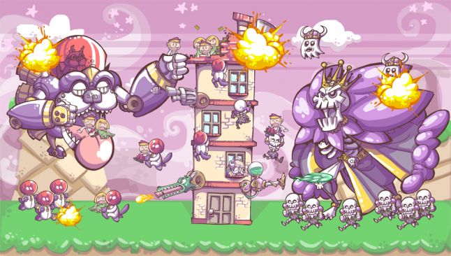 So what’s this game all about? In its final design, it’s about matching tiny blocks in order to turn them into bigger blocks, which players then slide to the left side of a house to load guns, each of which have different attacks and patterns. If they load these puzzle blocks to the right of the house, they’ll load special attacks, which affect larger areas. When the puzzle phase ends, after a time limit, enemies come to try to blast your house and steal your precious orphans. You use the guns and specials you’ve loaded during the special phase to defeat them in a sort of light tower defense mode.