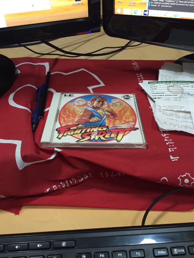 I played the six-button arcade version. I played the arcade version with the two giant novelty pressure-sensitive rubber buttons, which was terrible but I did it anyway. Later I played it a bunch more for the Turbo CD. I believe the Japanese Turbo CD version of Fighting Street bears the distinction of being perhaps the world's first CD-ROM game, copyright 1988 -- only a year after the 1987 arcade debut. And that copy I got when I was like 18 or so is still sitting here right in front of me on my desk at work.