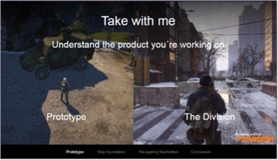 Anders Johansson shared some UI design thinking from The Division; a third person co-op experience in an open world with a heavy focus on RPG elements, or – as Anders summed it up – a game where players run around a lot trying to find things. As such, Anders’ talk largely focused on the design iterations that were carried out on the navigational user interface elements in the game.
