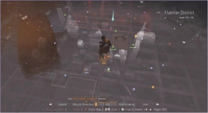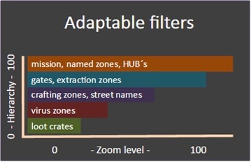 To get around this, like in many other games, The Division uses filters on the map. At first, the UI team allowed players to filter each individual map element, but playtest data and eyetracking heatmaps revealed that most players were unaware of this feature, and the players who were aware of the feature reported feeling overwhelmed by the amount of options they had. The UI team tried to find solutions from other games, but didn’t find any that were suitable for their cases until they looked at solutionsoutside of games, specifically from Google Maps which automatically filters content based on the level of zoom. This revelation led to the idea of The Division’s adaptable filter system.