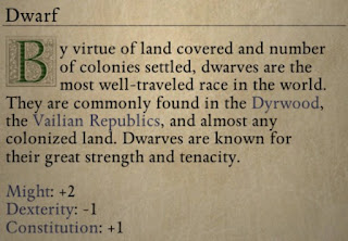 For each of the races, the description mainly says the lands they live in. Let's be clear. This is useless information. If I tell you dwarves come from New Jersey, whether or not you've heard of New Jersey, this tells you nothing about whether you want to be a dwarf in your adolescent power fantasy.