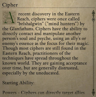 If you're a priest, you have to pick your god. If you're a caster, you have to select a spell or two from the starting list. For the Cipher, the list looks like this ...
