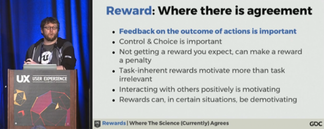 Ben Lewis-Evans (UX researcher) explored reward psychology, but first started by debunking a lot of neuromyths and extrapolations about dopamine and its role in motivation. Ben suggested to leave dopamine alone given that we don’t need, as game developers, to understand the physiology behind motivation. Instead, we need to understand how the environment (i.e. the game) is shaping player behavior. One of the main points of Ben’s talk is that reward is feedback, so it needs to be clear. If players don’t understand what they got or how they got it, they cannot be motivated to do the behavior again. His other recommendations were to mix the types of rewards, set and meet expectations, help players feel in control, and show the value of rewards. Ben emphasized that social comparison and competition can motivate, but comes with risks and could backfire, and promoted the idea of cooperation as a stronger motivation. Lastly, he warned about the unintended consequences of rewards, that could in some cases encourage unwanted behaviors.