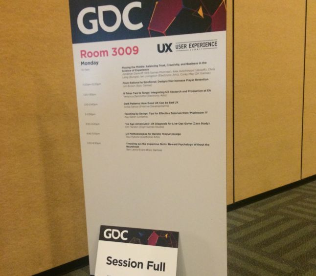 The GDC ‘17 UX summit was composed of eight sessions, each covering one specific aspect of the UX discipline, and represented various perspectives, from indie game developers to UX designers and user researchers. Attendance at the summit was in high demand; sessions were full all day and we had to turn away large crowds, which was heart-breaking yet very encouraging. Also, because many people could not get in, the GDC staff made all the videos accessible for free in the GDC vault (thank you!). I encourage you to check them all out. Below is a very brief description of each session, in order of appearance, with a link to the relevant video.