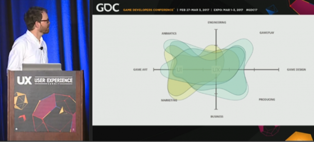 Paul Rybicki (UX Design Director) explained his process of UX design for mobile games, which is all about finding your way. To do so he mapped out where he felt UX stands in relation to all the game disciplines (engineering, game design, business, art).