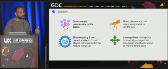 Om Tandon (UX Director) gave a case study from the development of the game Ice Age Adventure. He explained how to gather data from various departments, how to analyze the data and conduct a heuristic diagnosis, how to communicate and pitch a solution to stakeholders, and how to design a solution that resonates with business and user needs. Specifically, that once the UX designer has enough data to understand the problem, they need to clearly communicate with stakeholders to get their buy-in to design the fix. Om explained step-by-step how they identified issues in the game that led to churn and poor monetization results. He advocated for clarity and simplicity in the design, and the importance of reward presentation to engage players more. Om emphasized that it’s important to avoid raising a player’s expectation regarding rewards and then not deliver them. Lastly, Om went on to describe his process to prototype (wireframes) and implement UX design solutions.