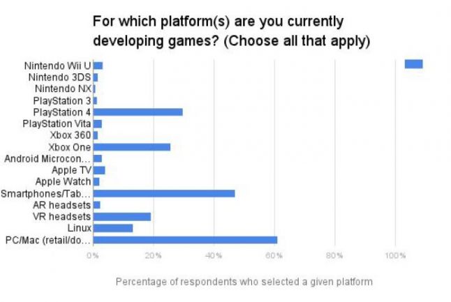 61 percent of this year’s respondents said the game they’re currently working on will see a release on PC/Mac, 46.9 percent said it would see a Smartphone/Tablet release and 29.6 percent said it would come out on PlayStation 4. 25.7 percent said it would see an Xbox One release.