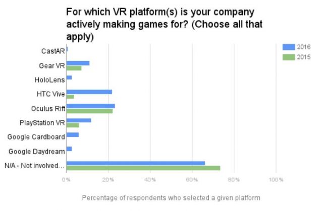 When asked which VR platforms they were currently making games for, 23.1 percent of respondents said the Rift and 22 percent said the Vive. 11.8 percent said the PlayStation VR headset, and it’s important to note that 66.3 percent said they weren’t involved in developing anything for VR/AR headsets.