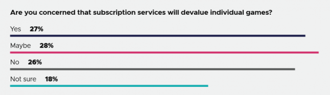 Game makers appear to be torn; 27 percent said they think subscription services will devalue individual games, 26 percent said no, and 28 percent said maybe. Another 18 percent said they weren’t sure, suggesting the game industry at large is just as curious as we are to see how these services affect the market.