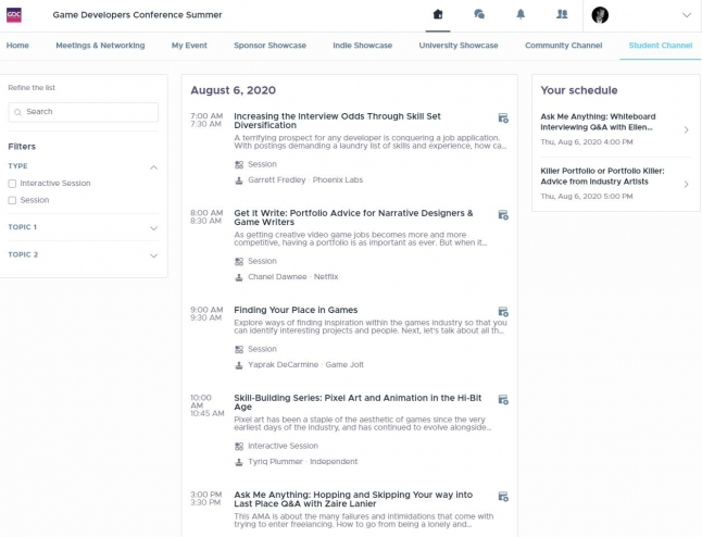 This is a unique strength of the virtual platform we'll be hosting GDC Summer on August 4th through 6th, and anyone looking to advance their game dev career or quickly learn new skills is invited to check out some of the cool content you'll find in the GDC Summer Student Channel.