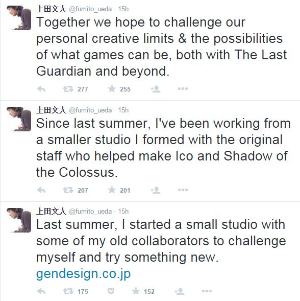 Shortly thereafter, Ueda (who left Sony in 2011 and continued working on The Last Guardian as a contractor) took to Twitter to hype his new studio: GenDesign, a Tokyo-based indie outfit staffed by former Team Ico developers like Ueda.