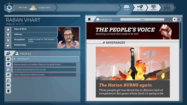 The player will be granted access to a more advanced build of Orwell. The old tools are all still there, useful in their own right. But the player will be invited to join “The Office”, a secret department of Orwell that has been equipped with tools that not only allow investigators to research individuals, but to also take that information and influence the way events are reported and perceived by the public. This gives the player more agency, not just in the way the story branches and consequences play out, but in the narrative itself--the story of Orwell: Ignorance is Strength.