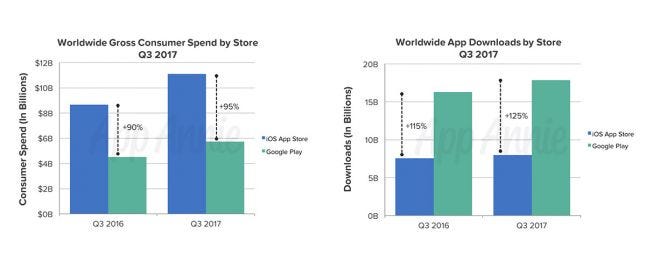 On the other side of the coin, worldwide consumer spending on iOS was nearly double that of Google Play, and Apple's marketplace increased it's lead compared to Q3 2016. Both stores, however, reached record levels as growth rates exceeded 25 percent.
