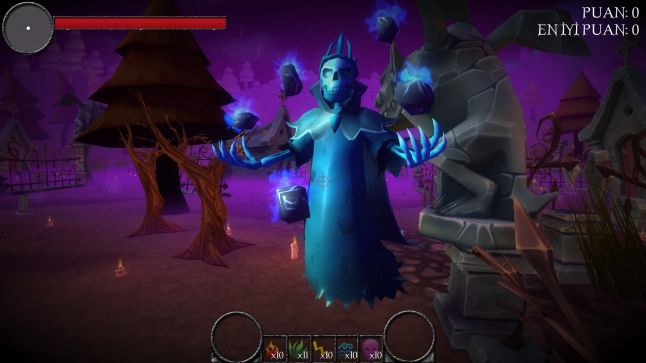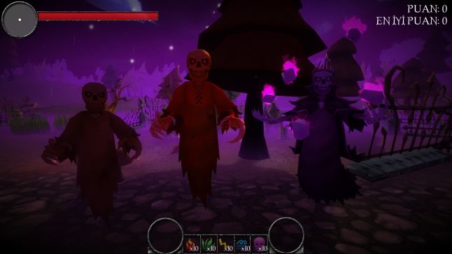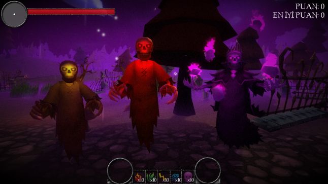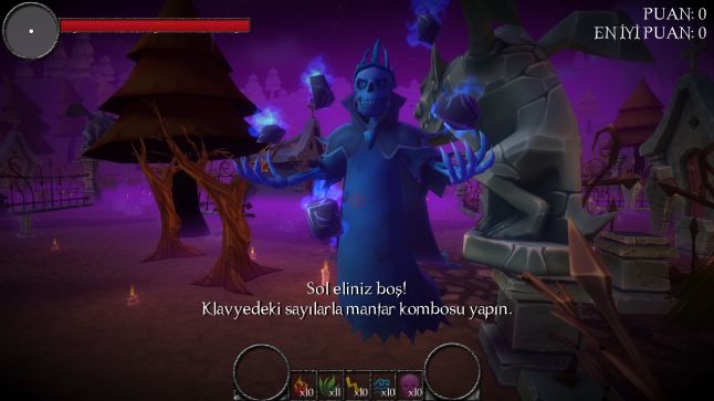 Your ammo is elemental mushrooms, there are 5 different elements of mushrooms those you collect from the ground. You create bombs with those elemental mushrooms (2 Fire, 1 Water, for example) using number keys 1 to 5. Your enemies also have elements; enemy’s element and the elements of your mushroom-bomb determine the damage you deal. For example, you deal more damage to a Fire ghost if you prepare a bomb with Water mushrooms.