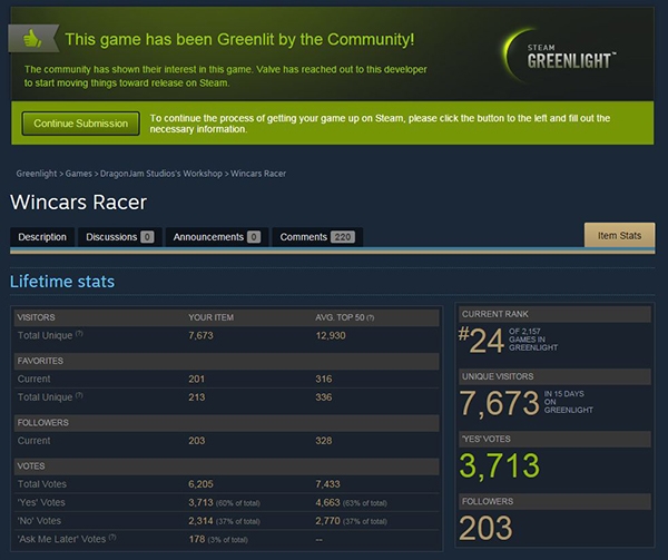 Last February 10th we excitedly launched a Greenlight campaign in order for Wincars Racer, our game in which a team of 8 people have been working for two years, to be released on Steam.