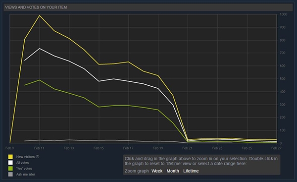 It is clear that the best thing to do is to try to concentrate your resources on a good launch and letting Valve’s system keep you visible for as long as possible. Never try a long term “leak” campaign as you will lose most of your options.