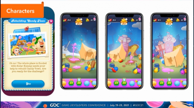 Even after data showed that over 80 percent of players couldn’t identify any facts about Candy Crush’s characters, plenty of folks at King apparently saw this as a non-issue. Rindo said she saw an opportunity—and eventually pinned down several core ingredients to add story to live events: blending context, characters, and conflict with Candy Crush’s core mechanics to help players better grasp the game’s story.