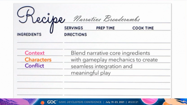 Rindo gave some other (candy-coated) narrative examples, but reminded developers to remember her core ingredients—Context, Characters, and Conflict. “Experiment with these, and find the right blend that works for you game, and your mechanics."