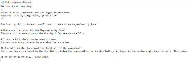 Recently, software developer, Juho Rutila, got in touch to invite me to make something for Nice Game Hints, which is an immediately impressive site and concept. It is structured like UHS and aims to provide incremental hints, via a flexible structure. Incredibly, Juho has made all of his development tools available for guide creators to use. I simply downloaded his demo, learned a few things about Github and Markdown, then made a guide for Henry Mosse and the Wormhole Conspiracy, to be published on Nice Game Hints. The file structure and syntax looks like the below. You can see the page, shown by the last screenshot, live, here.