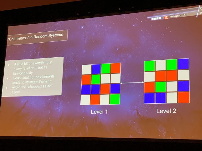 Another slide from Wilson illustrating how randomizing systems that output levels and other assets in small, homogenous "chunks" can give you a lot of levels that feel same-y, even though they're totally unique