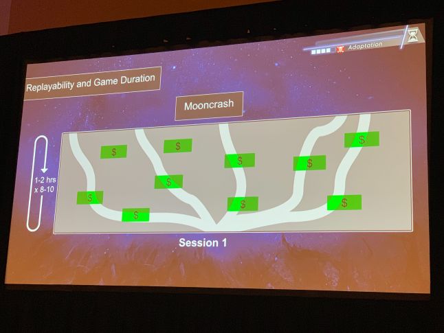 Here Wilson tries to sum up the design of Mooncrash in a similar slide, as the restrictions on what a player can accomplish in a given run ensure they'll see more of the game in shorter playthroughs