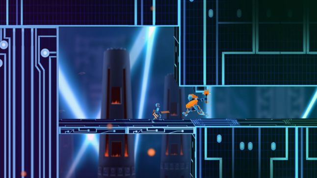 Arntzen’s beat-based gameplay bleeds into the level design too. He describes the game’s stealth sections as places where turrets change their directions based on the beat of a more mellow track, one he hopes players will get a sense of timing for thanks to the rhythm. In fact, says Arntzen, a lot of the levels are built after he gets tunes back from his composer.