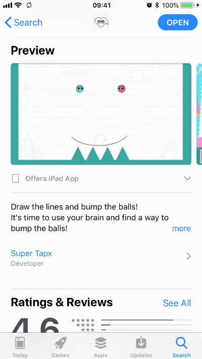 Love Balls’ listing on the App Store is instantly appealing, with a short video showing how the game works. The screenshots used aren’t overly polished, and are taken from the gameplay itself – they look “real” and accessible. The screenshots are also curated to show friendly-looking solutions: players having drawn hearts and smiley faces. These are much more eye-catching and personable than a level that involves drawing a standard shape, eg a triangle or line.