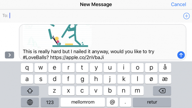 When the player chooses to share, the different level outcomes trigger different sharing texts: e.g. when making a challenge: "This is really hard but I nailed it anyway, would you like to try #LoveBalls?"