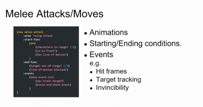 "We also have events in the melee attack. Those are like tags on the timeline of the animation such as hit frames, target tracking, and when certain characters in the middle of a melee move are invincible."