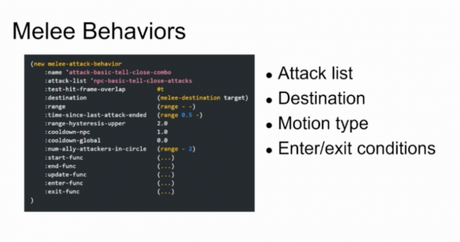 "One level up from melee attacks are melee behaviors. Each NPC can be in one melee behavior at a specific time, and a behavior contains an attack list -- a list of attacks the NPC can start from -- and also a destination, such as if an NPC wants to run up to the target or stay a certain distance away from the target," continues Chou.