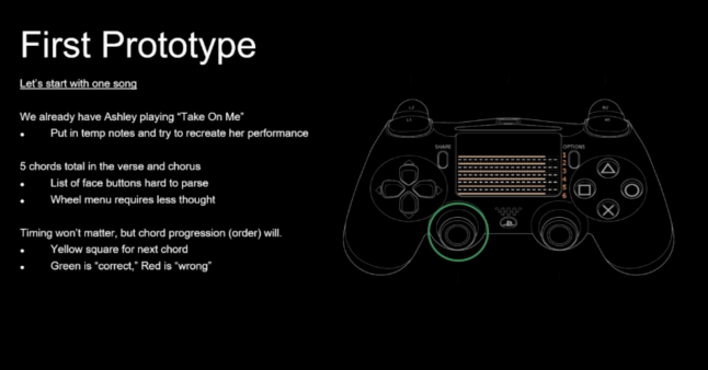 Burroughs noted there are five chords in 'Take On Me,' which meant the initial prototype had to allow the player to choose a chord from a list of five. "If we put [those chords] on a list connected to face buttons, however, players will have to either check or remember how the buttons are paired to the chords," he continues.