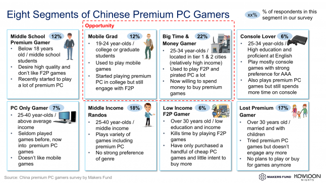 Another important segment is the “Big Time & Money Gamer” group—25 to 34-year-olds born in the 80s or early 90s, who grew up in a time when many Chinese families bought their first PCs. With little income or even means of legitimately purchasing PC titles, these gamers turned to downloading pirated games or buying them at local mom-and-pop shops. More than 70% of respondents in this group admitted that they used to play pirated PC titles.