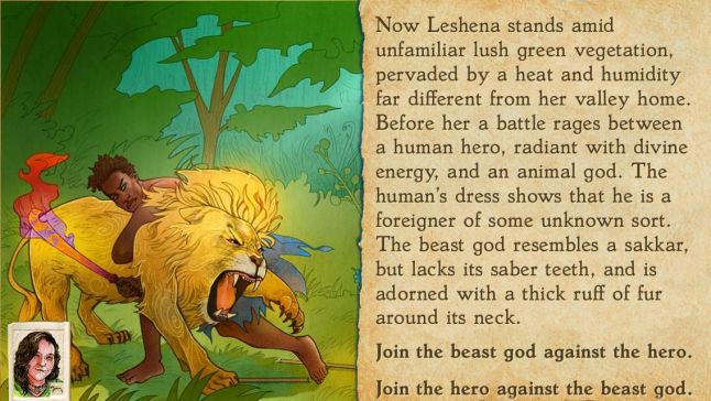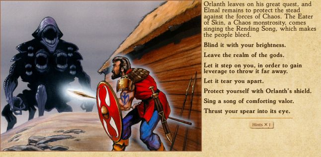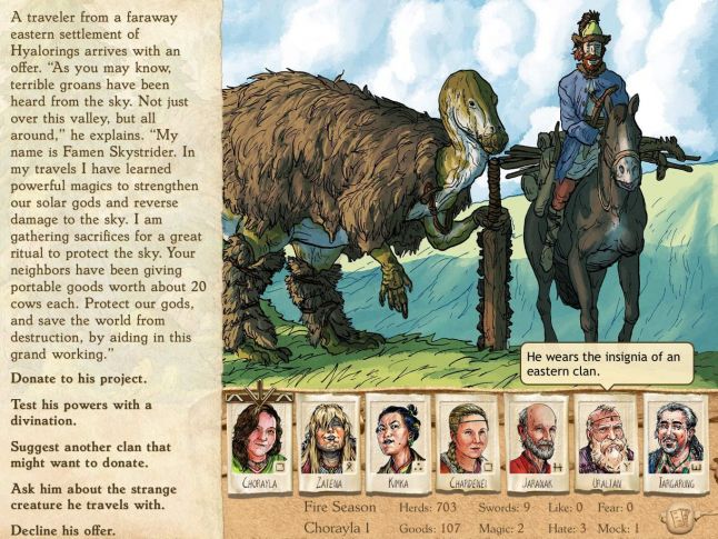 In King of Dragon Pass’ heroquests and in Six Ages’ equivalent rituals, players select a character from their clans to reenact a specific myth, and then they face a series of multiple-choice encounters in which they make choices about how the character will react to the way the myth unfolds, attempting to follow the actions of the original mythic hero.