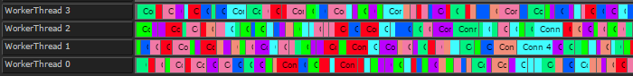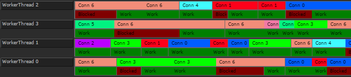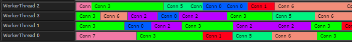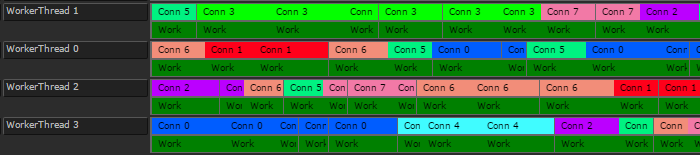 Conn N are our connection objects (or any object doing work in our worker threads for that matter). Each has a distinct colour. All good on the surface as you can see. Now lets look at what each Connobject is actually doing with its time slice.