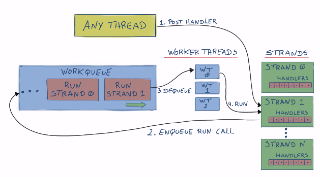 This also implies the use of the strand’s handler queue, since adding handlers to the strand from a thread which is not a worker thread will require the handler to be enqueued.