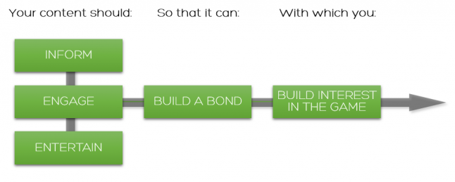 Growth content is all about building a user base – it’s getting as many people that haven’t heard about your game to come over to your social channels and become a member of your community. Examples of growth content include trailers, competitions, content that other social channels would want to post on their walls and still look cool (your screenshot might not be enough, but a video of something crazy/intense/funny might do the trick).