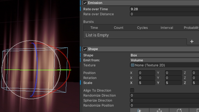 Time to choose a Shape, a Box should do the job. Tick the Emission and increase the Rate to make them pop the speed you want.