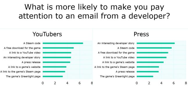 So this is clearly a rather large gap that can be potentially filled, and if you're planning to email the big YouTubers, it really makes sense to hit the smaller ones too for the reasons previously stated. But what should you be putting in a email to a YouTuber? Should you be wording it in the same way you'd word an email to the press? Sort of, but not exactly. Here I've compared answers from YouTubers and the press for the question, "What is more likely to make you pay attention to an email from a developer?" and you can see some obvious similarities and differences.