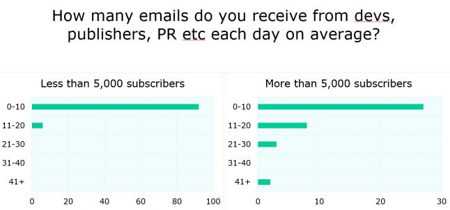 As you can see from the above charts, the big, top answer is "Video game press sites cover it" -- it turns out I'm not out of a job just yet! Indeed, many YouTubers who I have talked to tell me that they will regularly skim through traditional game press outlets to find out which games are being talked about the most, and make sure to cover these. It makes sense for them -- if a game is already being talked about lots, then the chances are that recording a video of it will grant them big view numbers. In other words, while getting YouTubers to notice you and your games is important, getting the traditional press onboard is equally important, and can act as a catalyst for getting some of the big YouTubers to cover your game. Other top answers: "Another YouTuber covers it" - YouTubers don't just look at the press - they look at what everyone else on YouTube is covering too! Hence why gunning for smaller YouTubers as well as larger ones might be a good idea. "Spot it on social media" - Having a presence on Twitter, Facebook etc is a must. This isn't just for getting YouTubers onboard - the press and players will often want to see if you're on social media too. "Emails from devs/pubs/PR" - Notice that this is a top priority for bigger YouTubers, but not at all for smaller YouTubers. Will address this in detail a bit later. I also asked those surveyed to provide details of anywhere else they find games. Reddit was the big one, with plenty saying that they scour /r/games, /r/gaming, /r/indiegaming and more for whatever is a big deal that day. Get to grips with Reddit if you haven't already! Also mentioned: "Friends." YouTubers want to play whatever their friends are enjoying, which is usually other YouTubers. Many YouTubers will band together with others, so if you can hit one, you might end up hitting them all. Keeping tabs on who knows who (via Twitter, for example) is a good idea. So let's focus on one particular answer here - emails. The big YouTubers in the survey suggested that email is a big part of where they grab games from, while the smaller YouTubers actually said it was the last place they go for finding games. So what's happening there? Why the massive difference? The answer is actually pretty obvious -- developers and publishers are emailing the big YouTubers to cover their games, but no-one is bothering to email the smaller YouTubers. It's not so much a case that smaller YouTubers don't care about email, but rather, no-one is bothering to email them!