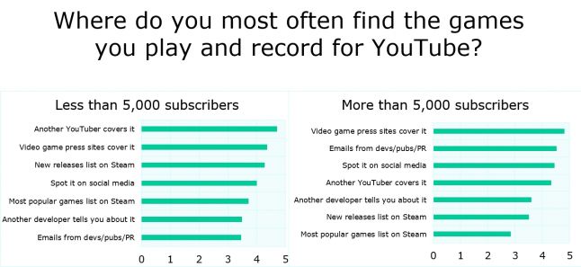 The first point to note is how my survey respondents are split in terms of subscribers. Nearly a third of those who filled out the survey are "big" YouTubers -- that is, YouTubers with more than 5,000 subscribers, and ranging all the way into the millions. The other two-thirds are smaller YouTubers with less than 5,000 subscribers. Now, I'm well aware that some developers will want to only target the bigger YouTubers, and thus only be interested in the results from these people. Therefore, I'm going to be splitting the results from the survey up for the most part, showing the results from the smaller YouTubers separately from the bigger ones. However, I would strongly advise that you do not disregard smaller YouTubers. As my survey results are about to show, many YouTubers will watch out for what everyone else is covering, and getting your game featured by a whole bunch of smaller YouTubers may well lead to a giant YouTuber covering you. Plus, you have to ask yourself: Why not talk to smaller YouTubers? It's likely none of these people were going to buy and record your game themselves, and even if only a small handful of people buy your game as a result of a smaller YouTuber recording your game, it's still totally worth doing. Let's kick off then: I asked YouTubers, "Where do you most often find the games you play and record for YouTube?" and gave them a list of seven options to rank in terms of importance.