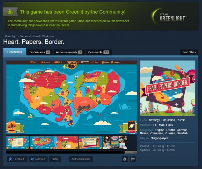 The bad news is that we clearly have a lot of work to do to build a community for Heart. Papers. Border. Especially since we are building this game as a service and we are preparing for a very long release strategy. But one thing that’s often overlooked is to have an opportunity to gather and study data, which is what Greenlight, unlike many other popular marketing options (like, say, attending conferences), does. What Greenlight excels at is a simple, straight forward option to ask players if they would like to play your game.