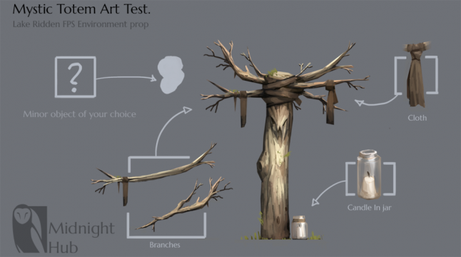 An example of concept art for a "hero prop". This was actually the art test we sent some of the artist applying for the internship at Midnight Hub. Each enlarged item tells a story and shows that there is a thought out idea behind the prop.