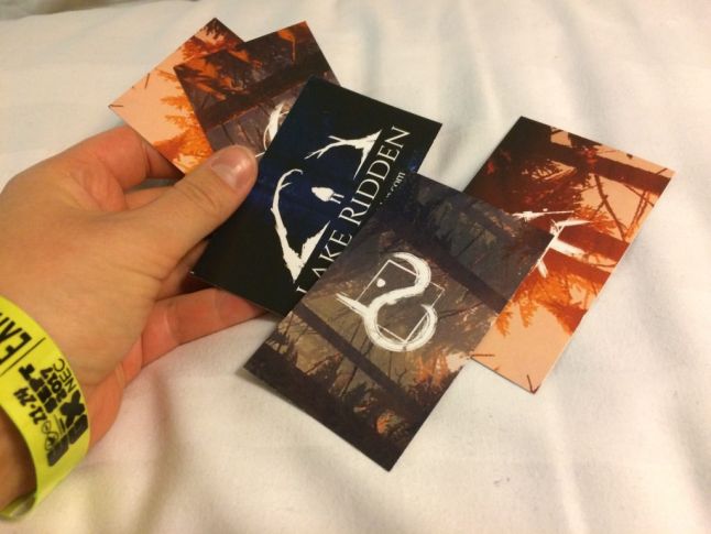 With this in mind, we decided to order 1000 small, Lake Ridden business cards to place in the EGX stand. We toyed around with the idea of having our most memorable screenshots on the cards, or to use symbols from Lake Ridden.