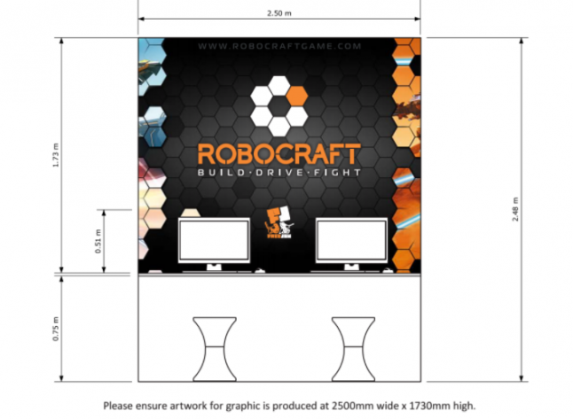 So when you know the measurements of your booth you need to take into account that the bottom part of your big poster will be partly obscured by screens and people hanging around. Never print anything crucial on this area, like the name of the game.
