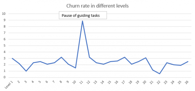 For the same game, no matter whether the pause of tasks is at 15 minutes or 20 minutes, level 11 or level 15, the high churn rate points will appear. Therefore, even if this interruption point is delayed, it can only hinder the time of player churn, but hard to really reduce player loss.